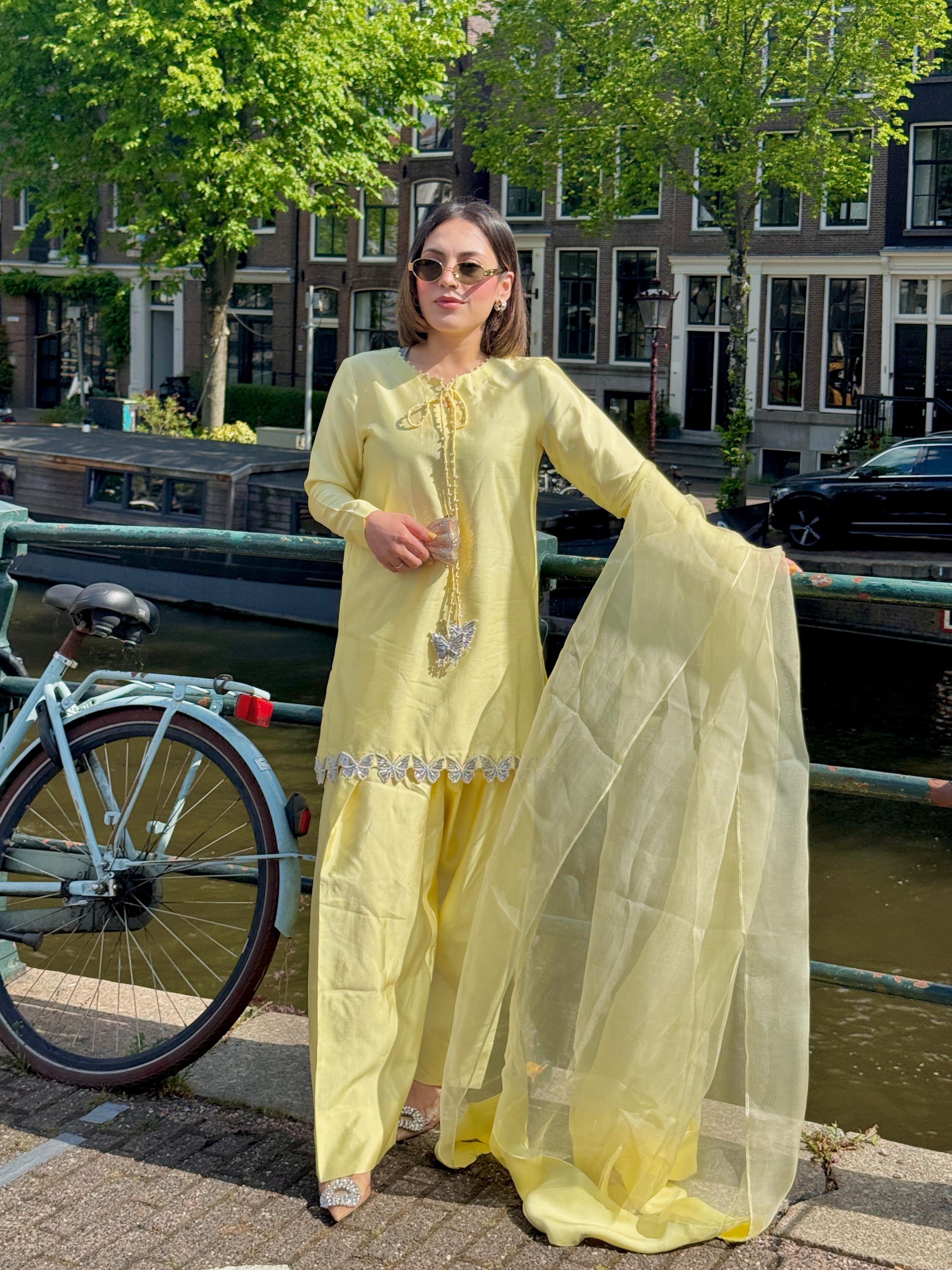Step into timeless grace with this exquisitely crafted three-piece ensemble. The shirt features a delicate pearl-finished neckline, beautifully enhanced with hanging butterfly tussles that add a whimsical charm.