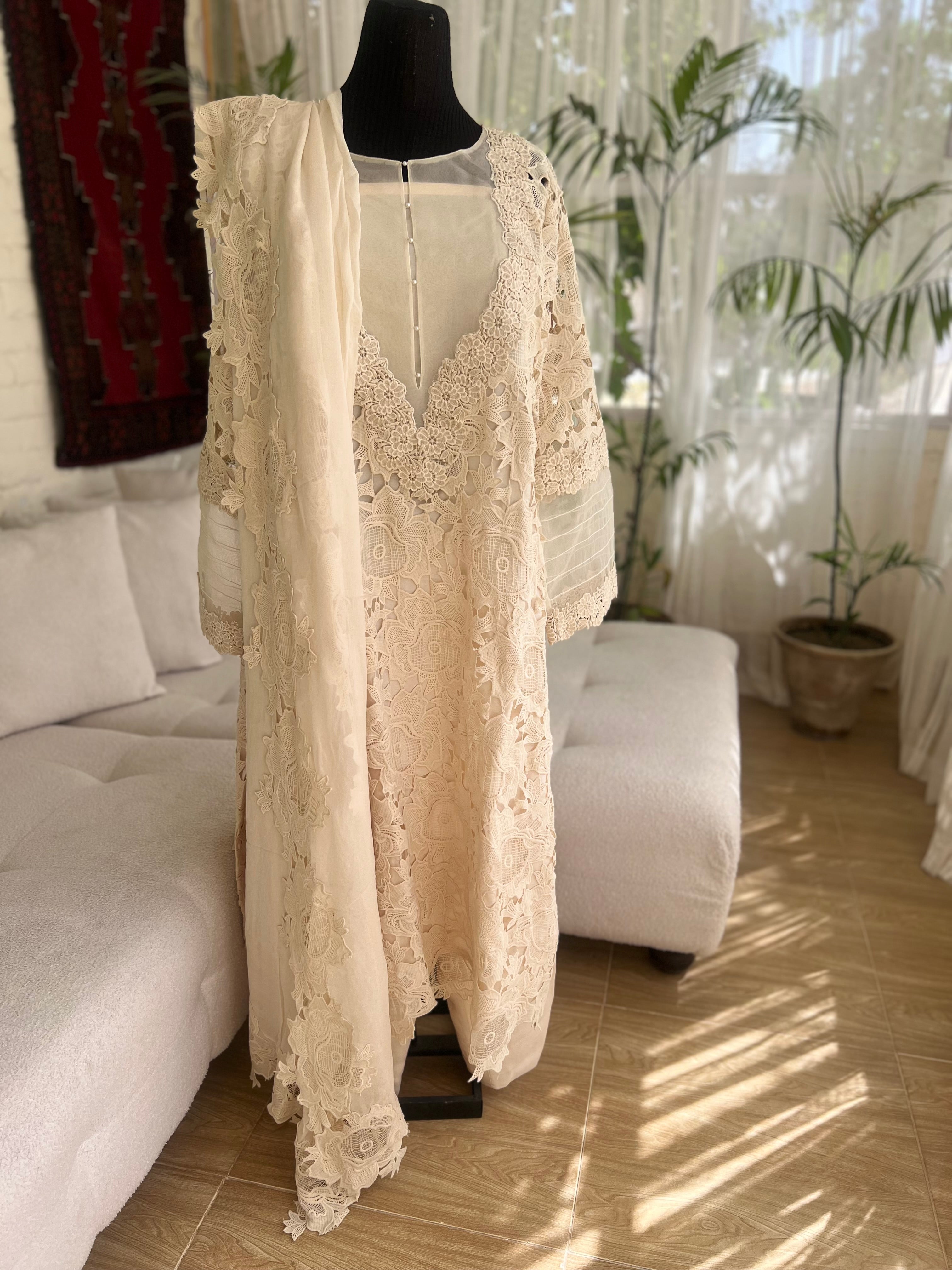 The look is completed with a gracefully adorned dupatta, finished with intricate four-sided net borders, and a matching trouser for timeless sophistication.