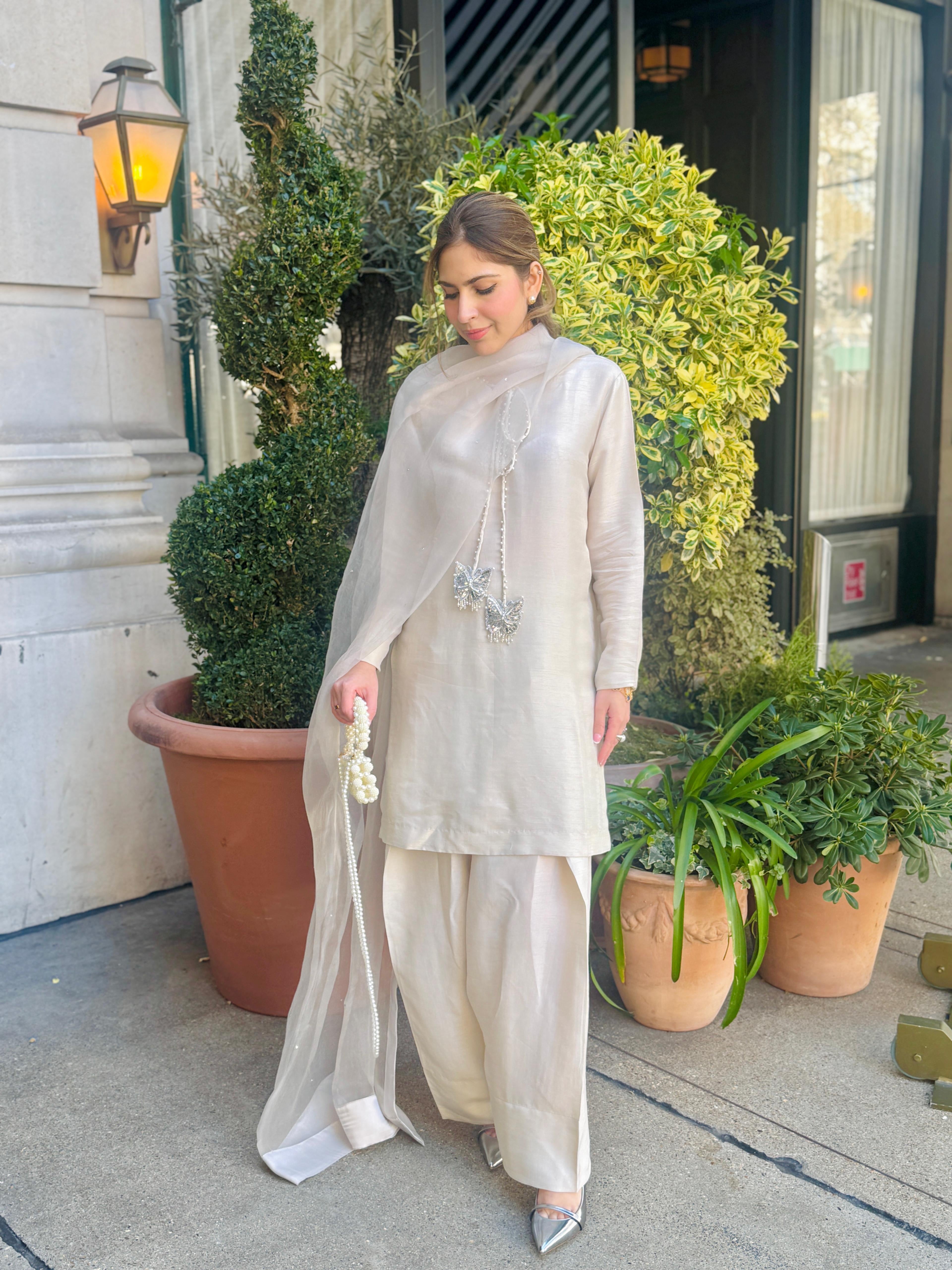 Exquisite raw silk shirt adorned with stunning jewelled butterfly tassels, paired with a classic Farshi shalwar. The...