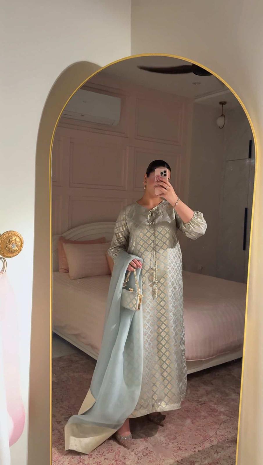 Paired with a lightweight organza dupatta, the ensemble flows effortlessly, creating a look that is both graceful and refined. The soft, airy fabric complements the intricate shimmer of the badla work, making it perfect for festive gatherings, intimate celebrations, or elegant evening wear.