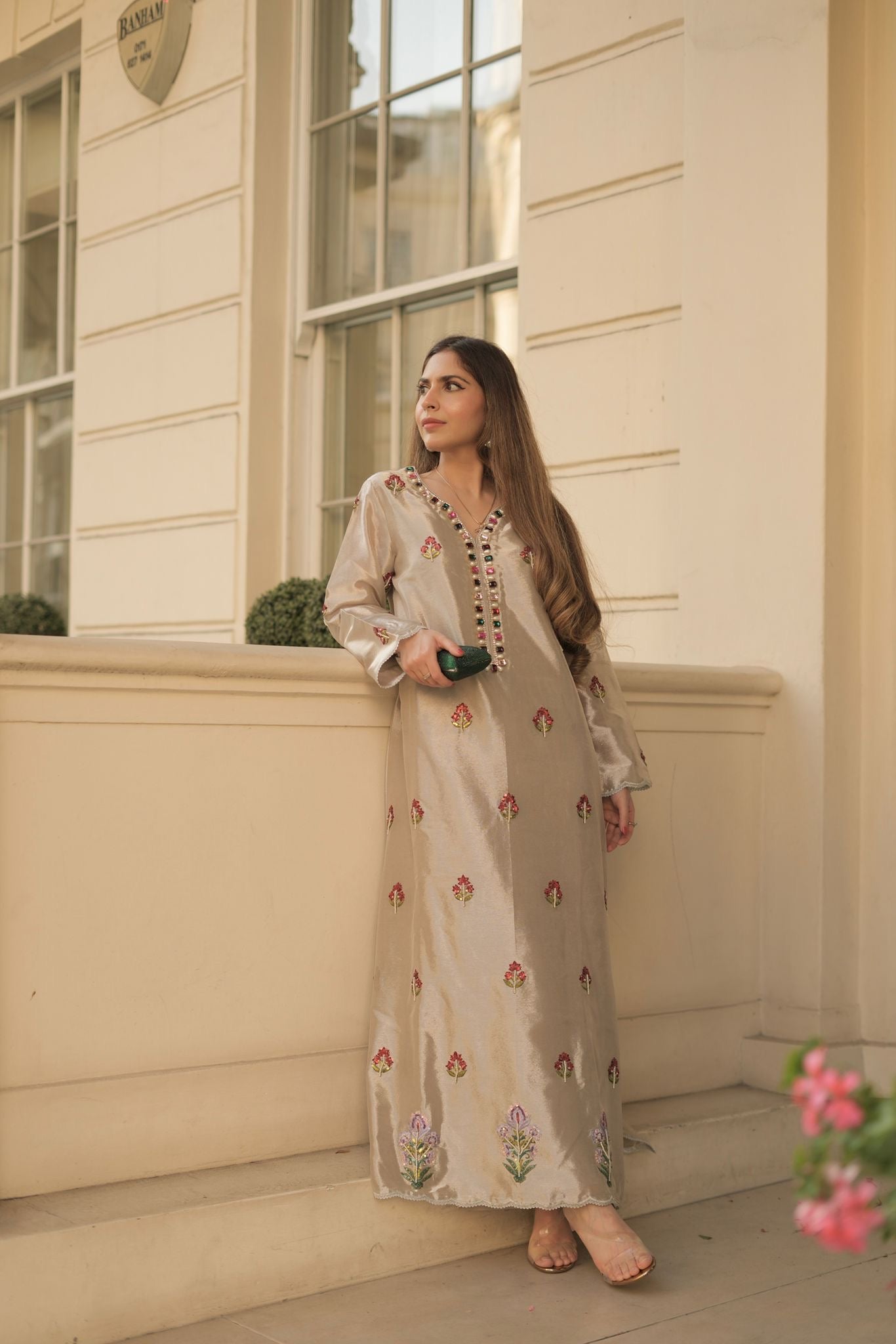 The kaftan is crafted from pure tissue fabric, radiating a soft, lustrous sheen that elevates its elegance. The front is adorned with delicate floral motifs, intricately created with fine threadwork and sequins, adding a touch of traditional finesse.