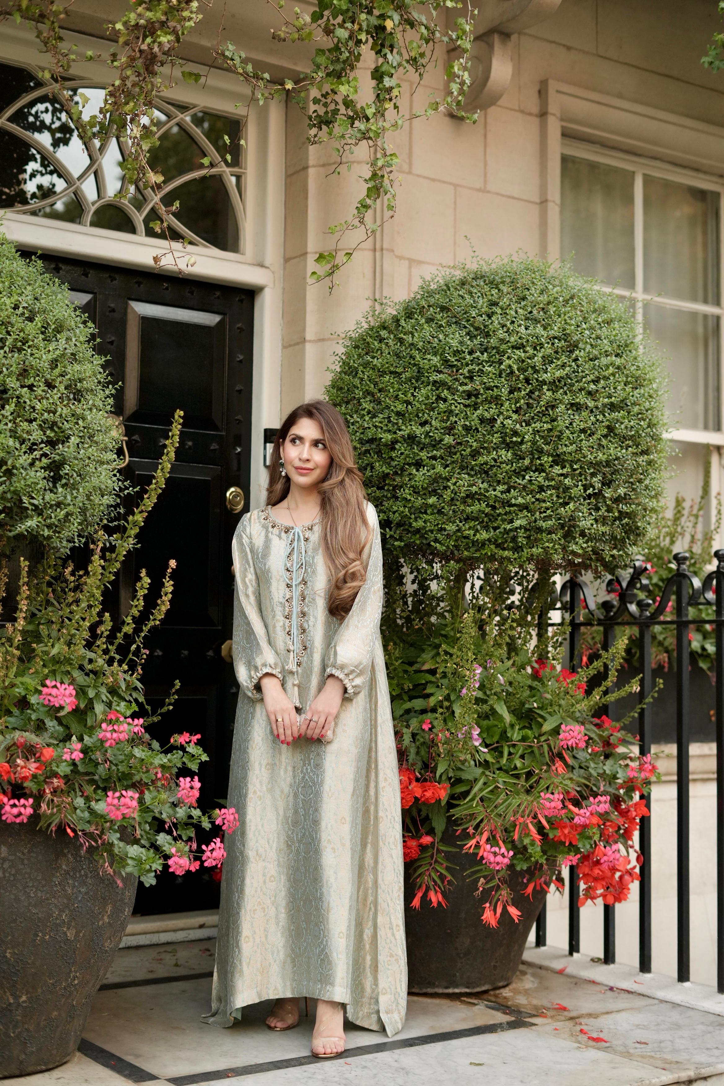 Pure atlas long shirt featuring exquisite adda work around the neckline, beautifully accented with handcrafted tassels.