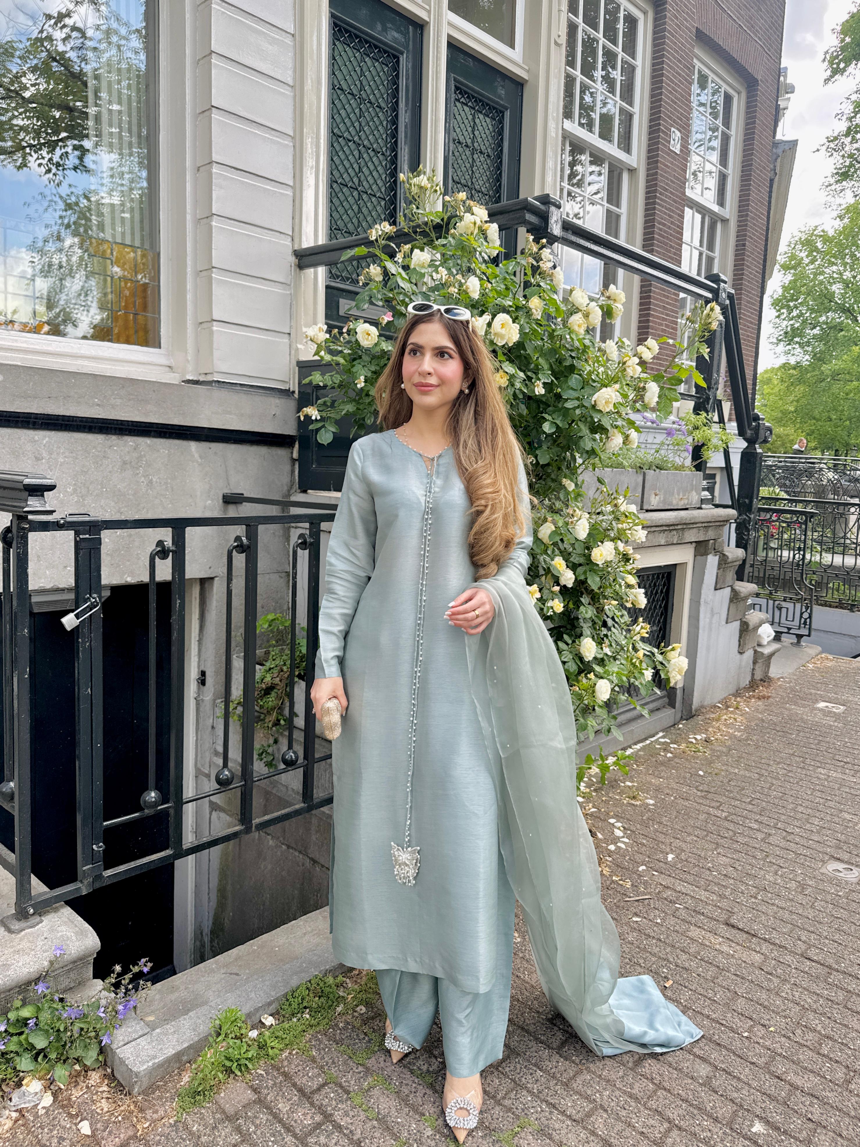 Exude timeless charm in this elegant three-piece ensemble crafted from luxurious raw silk. The shirt features a delicately adorned pearl-finished neckline, enhanced with graceful butterfly hanging tussles that add a touch of whimsy and femininity.